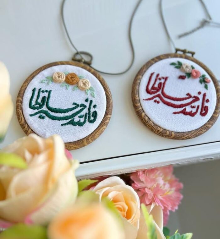 These circular pendants are a blend of traditional Arabic calligraphy and modern handmade elegance. Decorated with floral embroidery and set in rustic hoops, they’re perfect for gifting or personal wear. Each set contains 2 unique pieces.