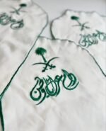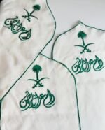 Celebrate national pride with our beautifully embroidered hair scarf featuring the iconic Saudi emblem and calligraphy. Made from soft, breathable fabric and finished with green thread accents, it blends tradition with style — ideal for National Day, heritage events, or gifting.