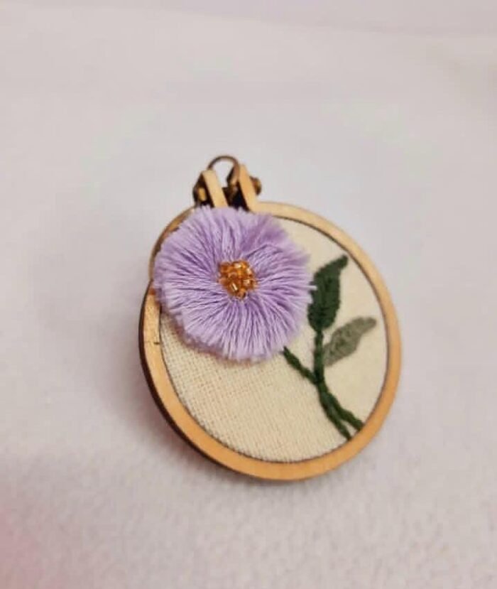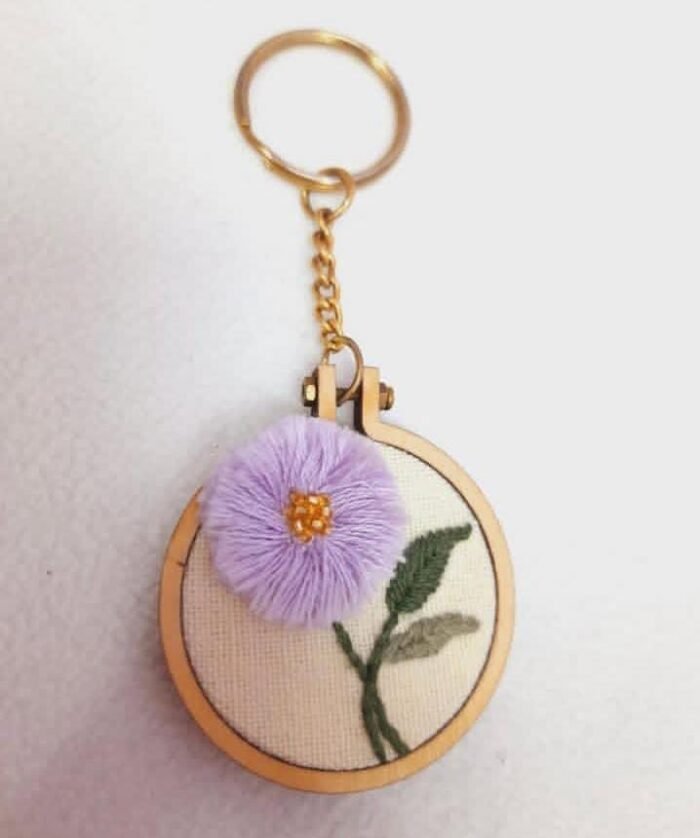 A delicate accessory for bags or keys, this handcrafted keychain features a soft lavender flower with yellow center and embroidered leaf details — a small piece of handmade beauty to carry with you every day.