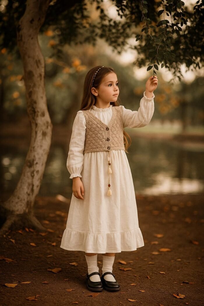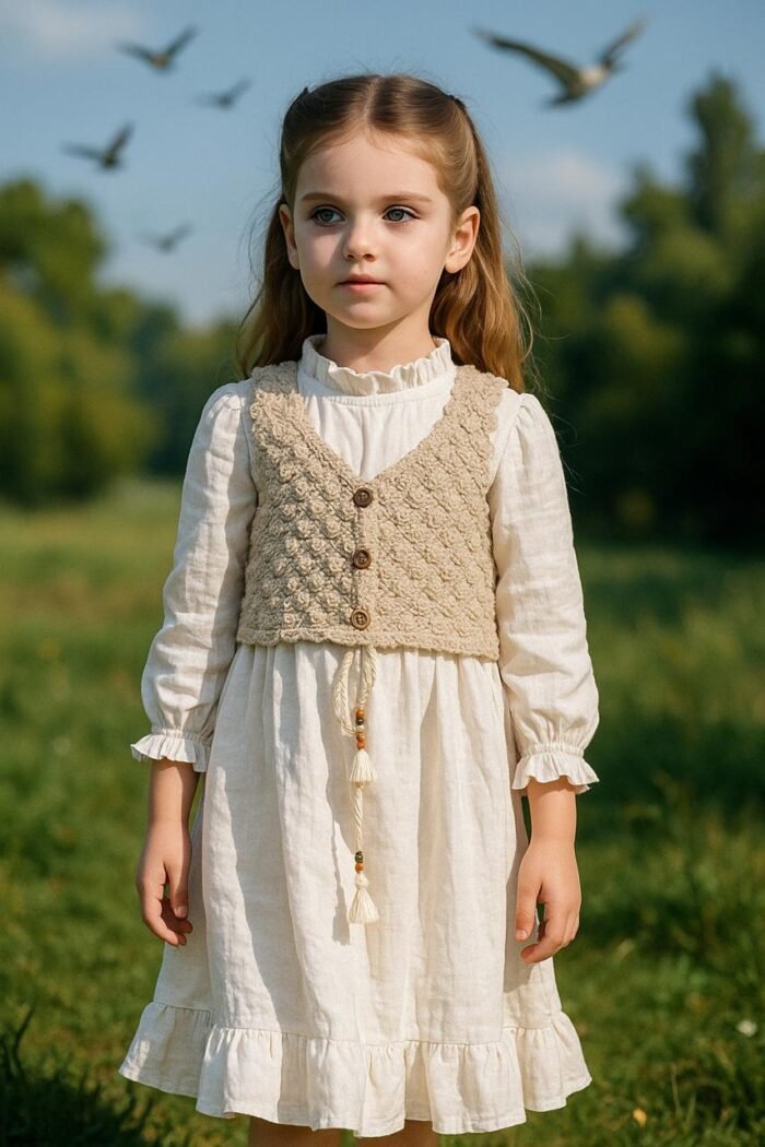 A charming vintage-inspired ensemble for girls, featuring a soft ivory ruffled dress paired with a hand-crafted crochet-style waistcoat. Perfect for autumn walks, woodland shoots, or rustic-themed events, this outfit offers elegance with a cozy countryside touch.